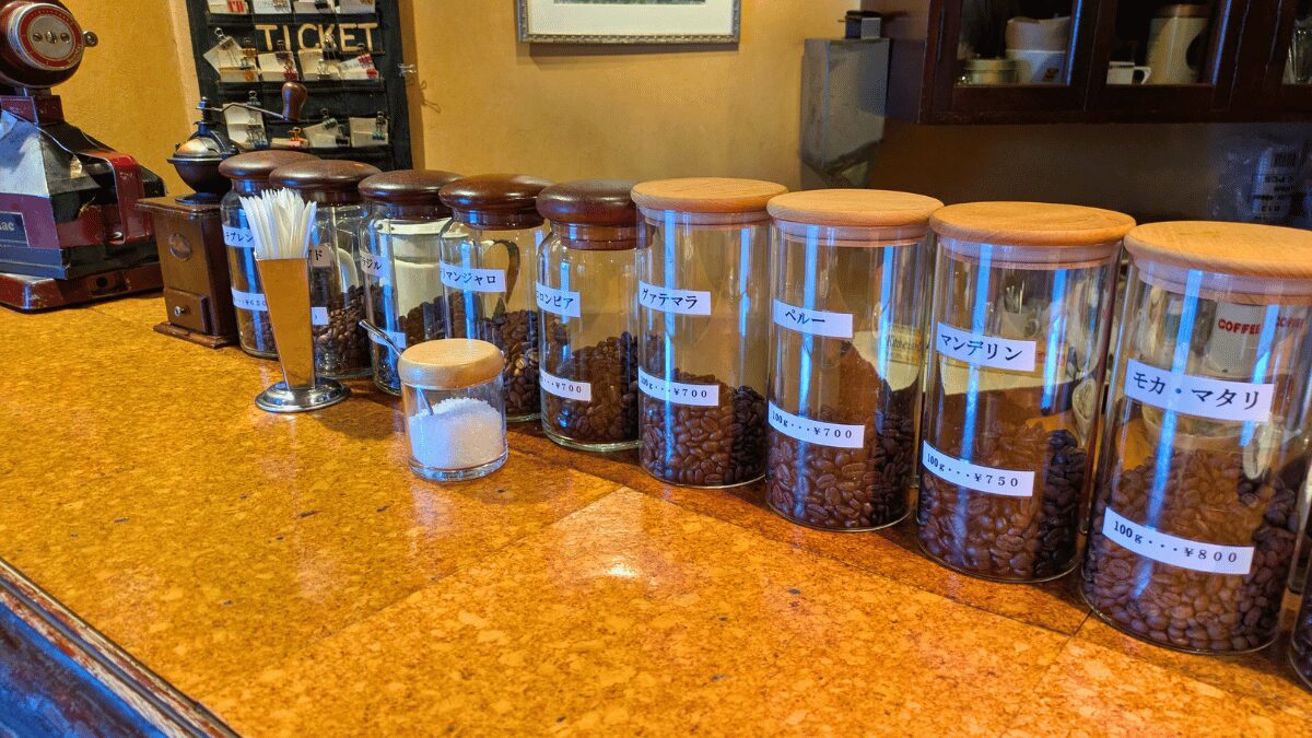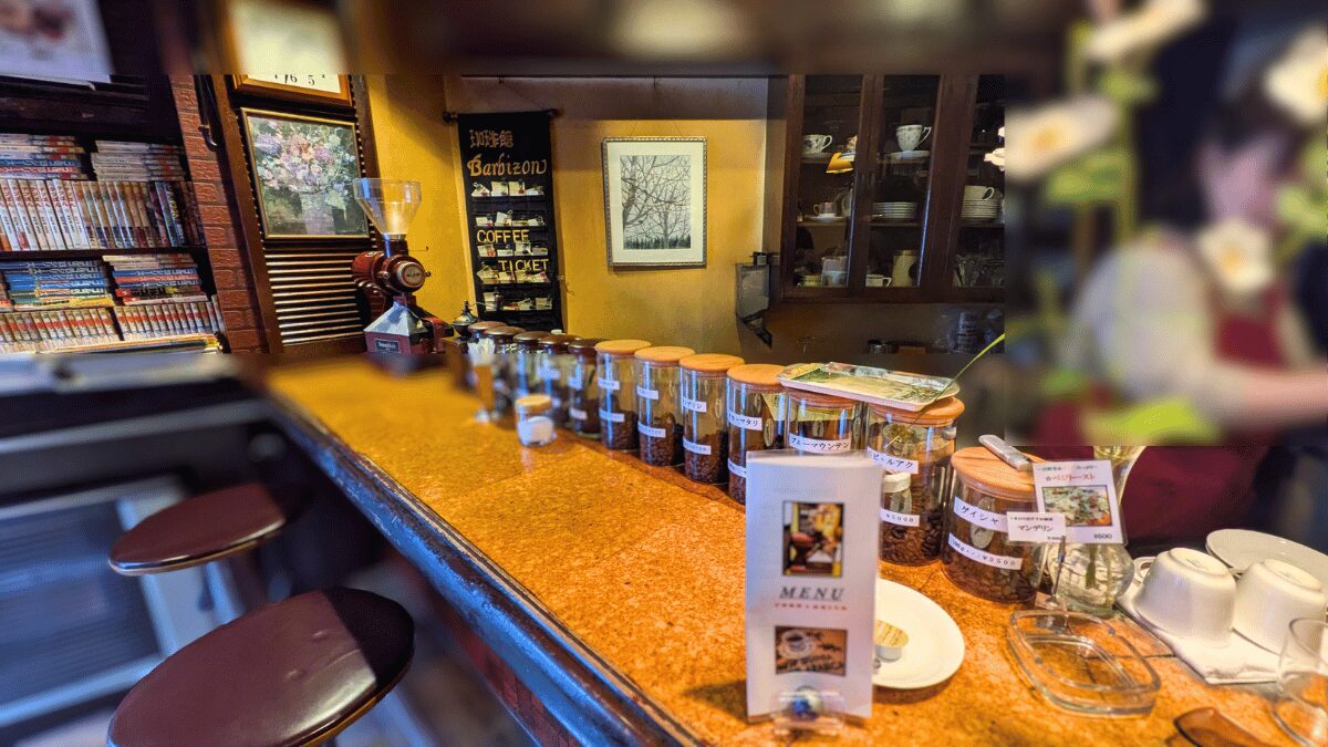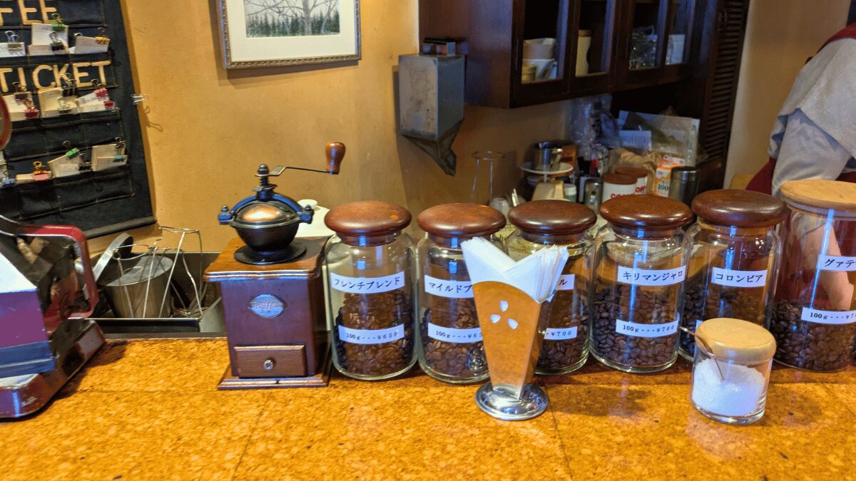 木のカウンターに並ぶコーヒー豆の瓶、落ち着いた照明、壁に飾られた絵画――そのすべてが懐かしく、心地よい時間を演出してくれます