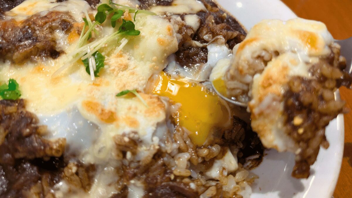 スプーンを入れると、黄身がチーズとカレーに溶け込み、濃厚でコク深い味わいになります。