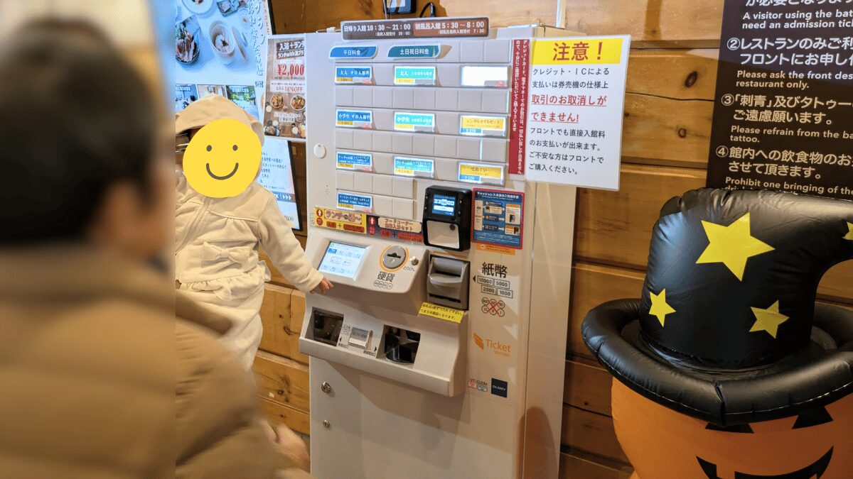 初めて訪れる人でも分かりやすいよう、券売機上部には料金表が写真付きで表示されています。シンプルな操作でスムーズに入館できるのが嬉しいポイント。